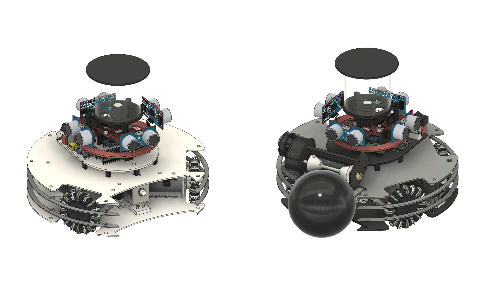 機体の重量制限が厳しい中、4輪オムニホイール、ソレノイドキッカー、ボールを保持するためのドリブラー、自作全方位ミラーを用いた全方位カメラ、4つの超音波センサーといった多くの機構を詰め込んだオフェンス機体